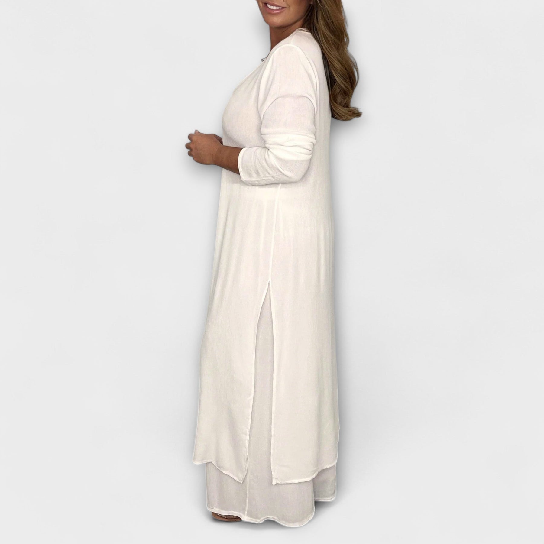 El conjunto de verano Neve combina elegancia estilosa con el máximo confort. La blusa fluida con escote en V y finas mangas aporta un look femenino, mientras que los pantalones holgados con cintura elástica realzan tu figura de manera favorecedora, sin apretar.